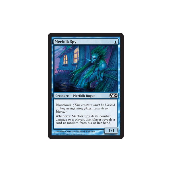 Text na kartě: Islandwalk (This creature can't be blocked as long as defending player controls an Island.)Whenever Merfolk Spy deals combat damage to a player, that player reveals a card at random from his or her hand.