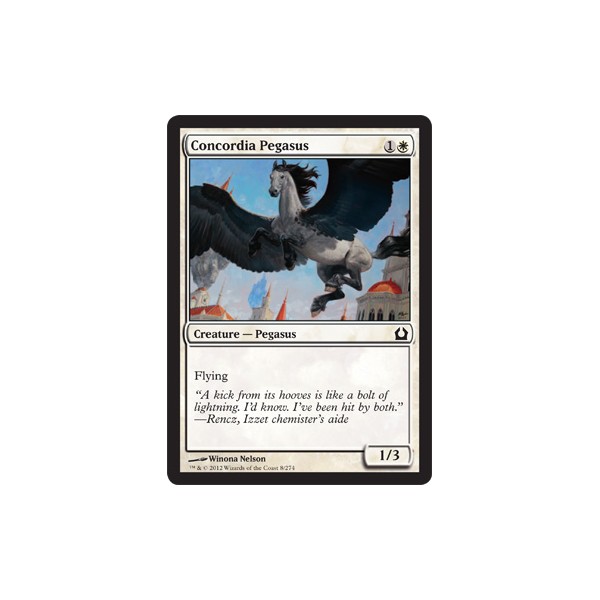 Příběhový text karty: "A kick from its hooves is like a bolt of lightning. I'd know. I've been hit by both."—Rencz, Izzet chemister's aide