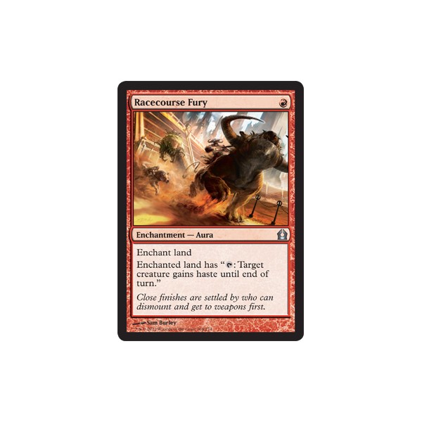 : Target creature gains haste until end of turn." Příběhový text karty: Close finishes are settled by who can dismount and get to weapons first.