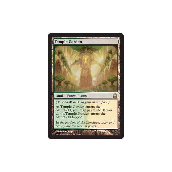 to your mana pool.)As Temple Garden enters the battlefield, you may pay 2 life. If you don't, Temple Garden enters the battlefield tapped.